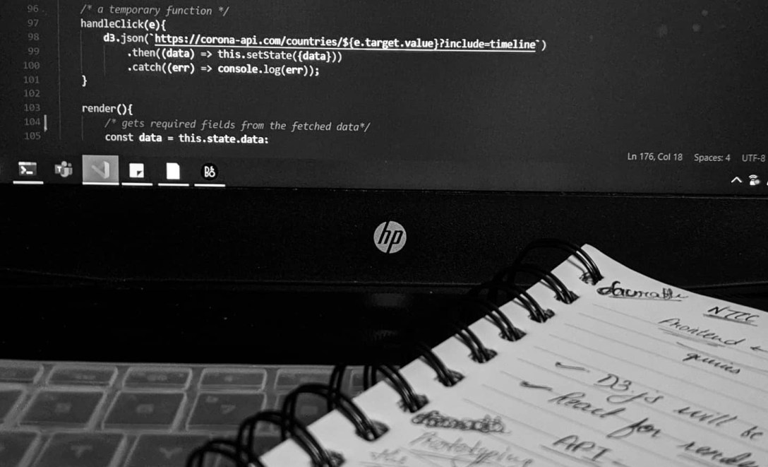 This whole idea of me building my first Data visualization project started because of 2 things: my college and freecodecamp. I was learning React through resources from freecodecamp, and there I found what was a, you guessed it, shining tutorial of D3.js. Also, I had to make a project for college, and what’s a better motivation than a deadline for college assignment. So, I thought of making a visualization for COVID-19 statistics.