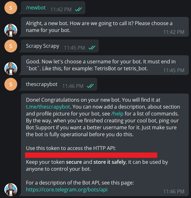 Now carrying over the same excitement, I start looking for how can I create my own telegram bot. The answer came in the form of Flask, which is a micro web server written in, you guessed it Python and python-telegram bot module which as the name suggests makes communication with the Bot much easier. I created a Telegram Bot using Telegram’s BotFather bot which also provided me with an access token which I later used to contact the Bot.
