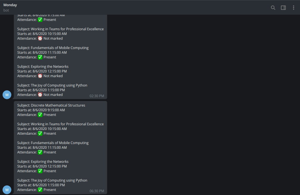 Yes, I call the bot ‘Monday’. It notifies me about my scheduled classes at 8 AM in the morning, and about my attendance at 2:30 PM, 6:30 PM and 11:30 PM. On Sundays, It gives me a notification about my overall attendance in al subjects.